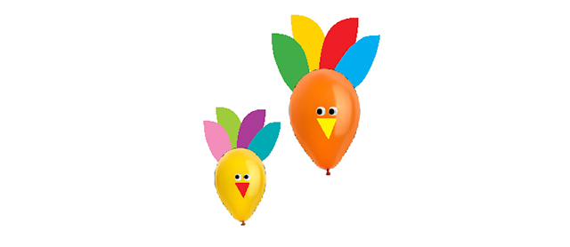 - First, make a turkey balloon. (Careful: Deflated balloons are a choking hazard.) Cut feather shapes and a beak from paper. Cut circles for eyes or use googly eyes. Inflate balloon and use double-stick tape to attach the pieces.
